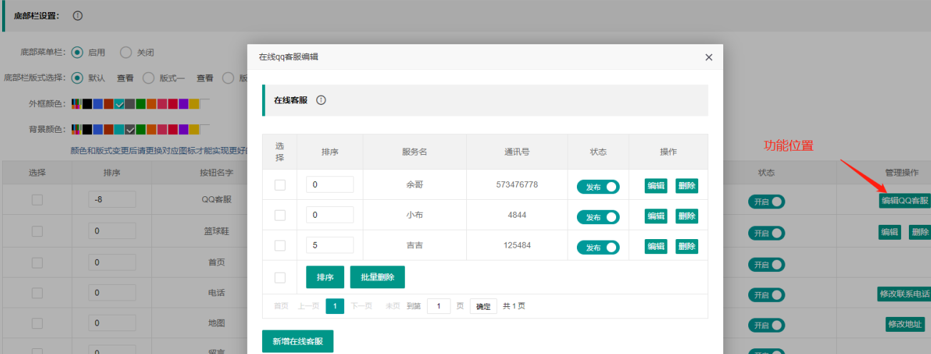 底部欄菜單編輯頁面,其中編輯”QQ客服“可添加多個(gè)賬號(hào),同時(shí)所有底部欄支持顯示多個(gè)客服