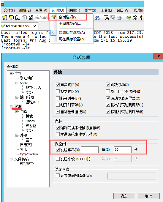 會話選項(xiàng) –> 終端 –> 反空閑–>選中發(fā)送協(xié)議 NO-OP(p) 每 60 秒。