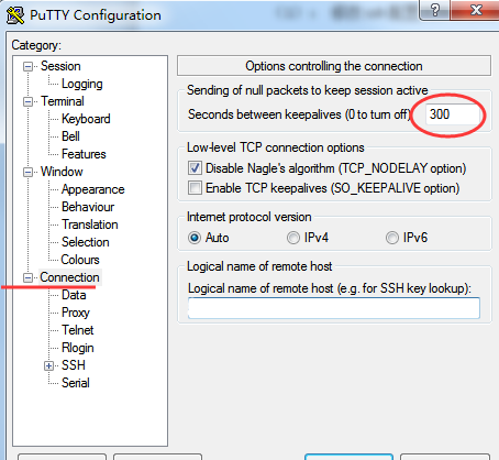 putty -> Connection -> Seconds between keepalives ( 0 to turn off ), 默認(rèn)為0, 改為300