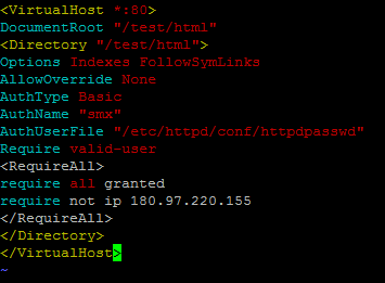 例2: 默認禁止所有IP直接訪問站點(要想訪問,需要輸入賬號驗證權(quán)限才能繼續(xù)訪問),僅允許特定IP能直接訪問站點。