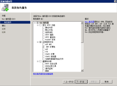 4.在角色服務(wù)中勾選需要安裝的功能。(“常見HTTP功能”,全部勾選。“應(yīng)用程序開發(fā)”,全部勾選!敖】岛驮\斷”,可以只勾選默認(rèn)的也可以全部勾選。“安全性”,可以只勾選默認(rèn)的也可以全部勾選!靶阅堋保抗催x!肮芾砉ぞ摺,可以只勾選默認(rèn)的也可以全部勾選。“IIS6 管理兼容性”,全部勾選!癋TP服務(wù)器”,需要使用全部勾選,注意會和其他FTP沖突!癐IS可承載 Web 核心”,全部勾選)。