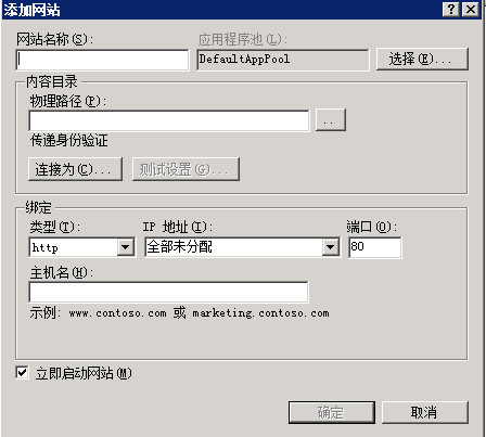12.在添加網(wǎng)站窗口中填寫所需要創(chuàng)建的網(wǎng)站站點信息(網(wǎng)站名稱,可以隨意填寫,可以和網(wǎng)站文件夾名稱一致方便管理。物理路徑,選擇至搭建網(wǎng)站站點的文件夾目錄,需要選擇到一級目錄。類型,選擇網(wǎng)站站點類型。IP 地址,選擇需要綁定的IP,可以不分配。端口,填寫需要設(shè)置的端口,默認(rèn)為80。主機名,填寫所需要綁定的網(wǎng)站站點域名,可以空置在搭建完畢后再綁定。),設(shè)置完畢后點擊確定創(chuàng)建網(wǎng)站站點。