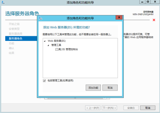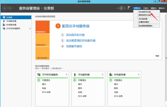 2.點開管理并選擇添加角色和功能,開始安裝設置。