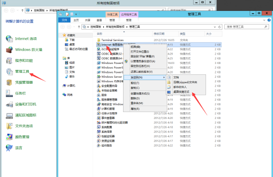 15.右鍵選擇“Internet 信息服務(IIS)管理器”,選擇 “發(fā)送到”→ “桌面快捷方式”。方便下次對網(wǎng)站站點操作。