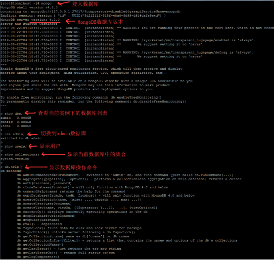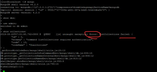 對(duì)比 2.8 可以看出開(kāi)啟了用戶(hù)權(quán)限驗(yàn)證后再用mongo命令登入數(shù)據(jù)庫(kù),不能查看當(dāng)前實(shí)例下的數(shù)據(jù)庫(kù)列表信息,查看集合的時(shí)候會(huì)報(bào)查詢(xún)錯(cuò)誤、查詢(xún)失敗。