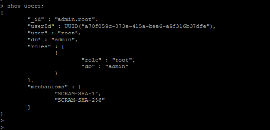 2.9.3 查看管理用戶(hù)root , 角色為root(只在admin數(shù)據(jù)庫(kù)中可用。 超級(jí)賬號(hào),超級(jí)權(quán)限)。