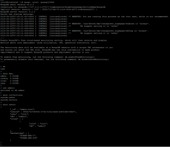 # mongo -uroot -pyang123456 看下效果